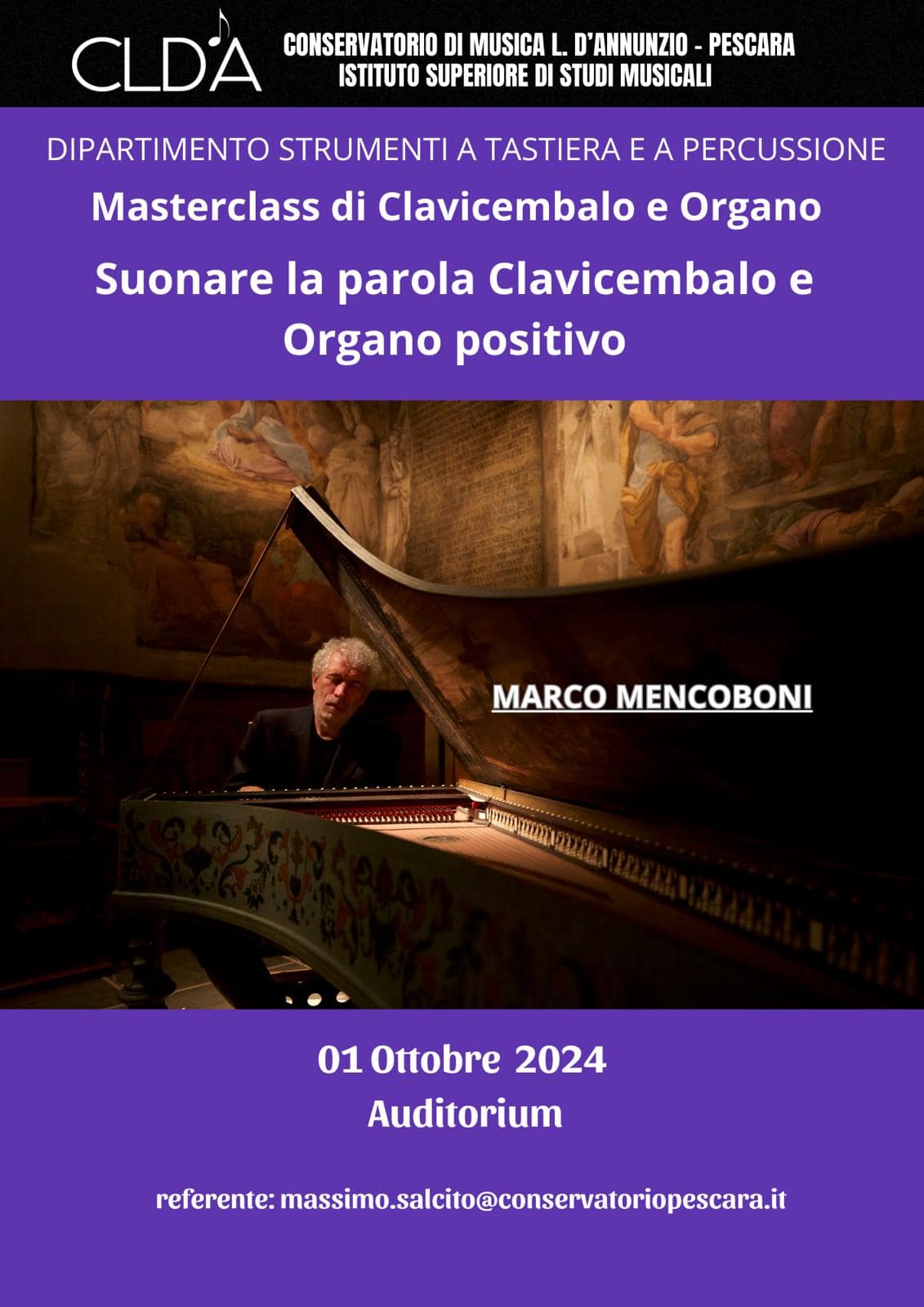 Martedì 1° Ottobre 2024, presso il Conservatorio di Musica “Luisa D’Annunzio” di Pescara, dalle ore 10.00 alle ore 13.00 e dalle 14.00 alle 17.00, si terrà una masterclass di musica antica (clavicembalo e organo), tenuta da uno dei massimi interpreti viventi delle tastiere storiche, Marco Mencoboni. Il musicista marchigiano vanta un eccellente curriculum vitae solistico, allievo diretto del M° Gustav Leonhardt ad Amsterdam, nonché uno dei più originali direttori d’orchestra grazie alla creazione del gruppo “Cantar Lontano”.
